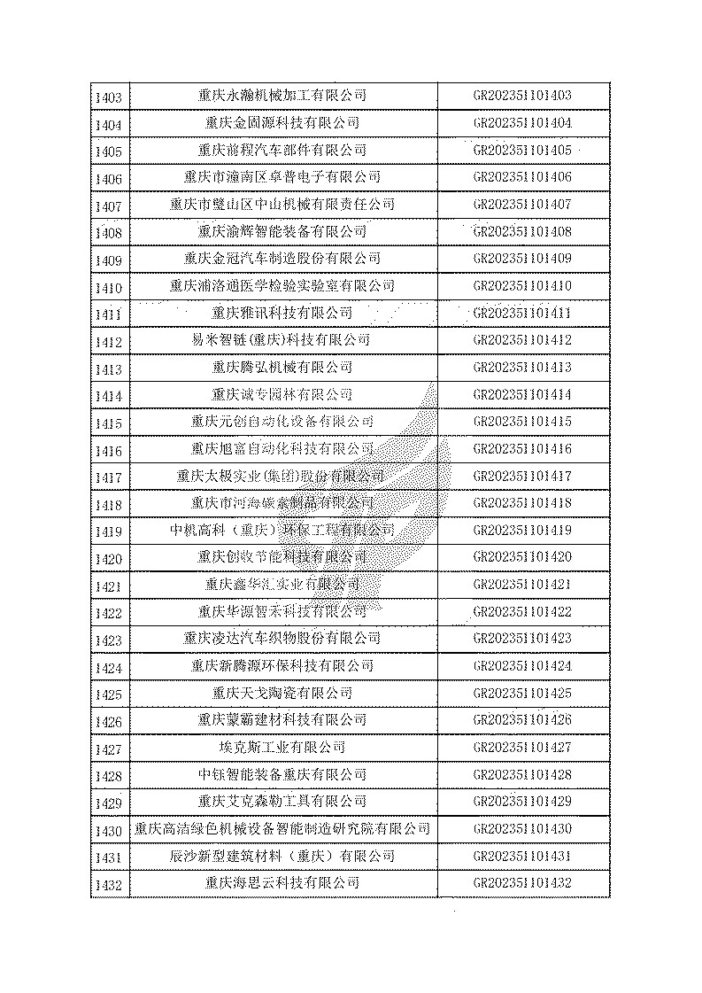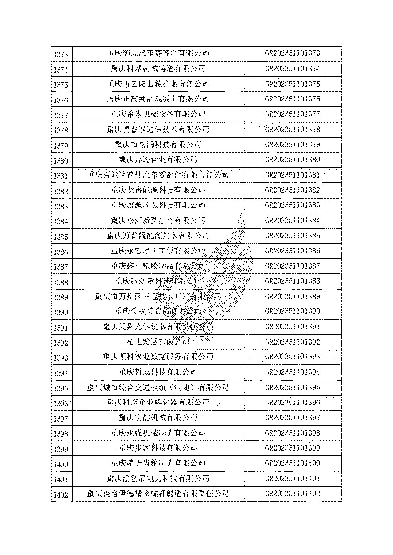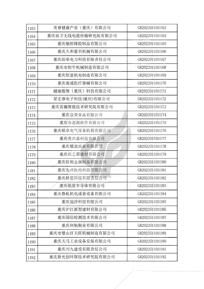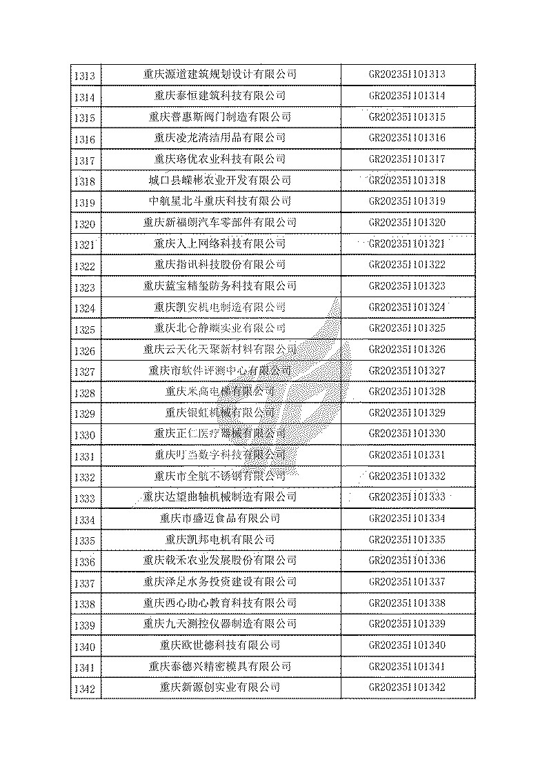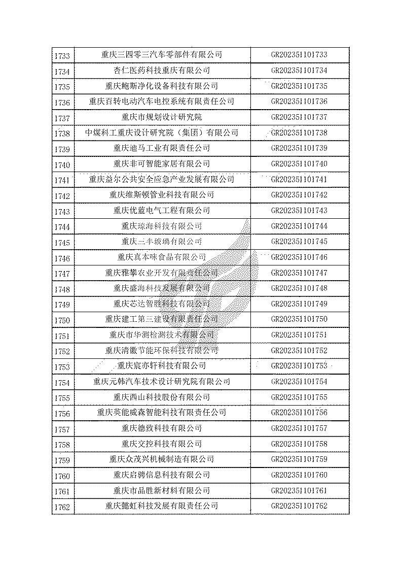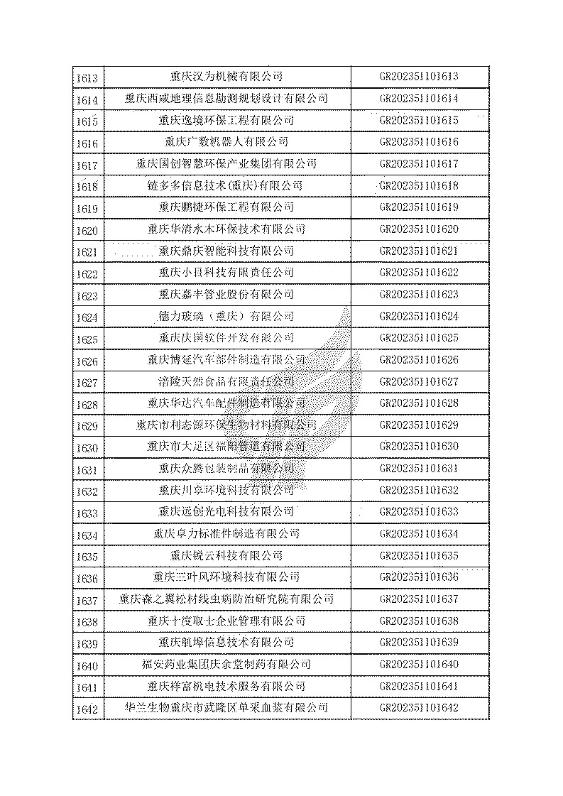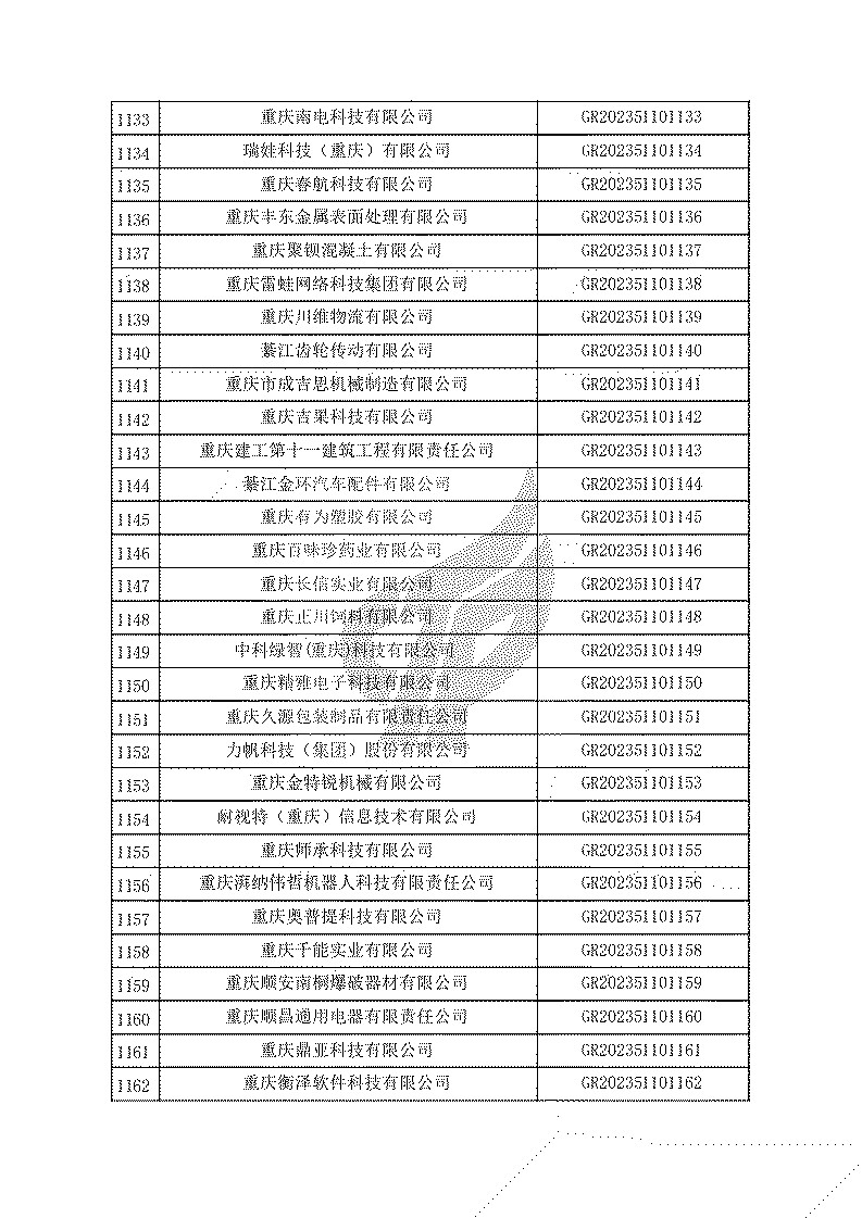 根據(jù)《高新技術(shù)企業(yè)認(rèn)定管理辦法》(國(guó)科發(fā)火〔2016〕32號(hào))和《高新技術(shù)企業(yè)認(rèn)定管理工作指引》(國(guó)科發(fā)火〔2016〕195號(hào))有關(guān)規(guī)定,現(xiàn)對(duì)重慶市認(rèn)定機(jī)構(gòu)2023年認(rèn)定報(bào)備的第一批1779家高新技術(shù)企業(yè)備案名單予以公告。