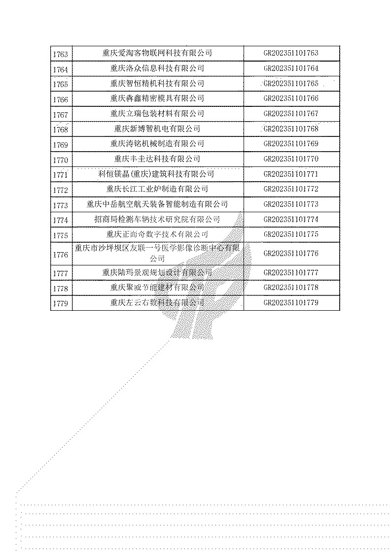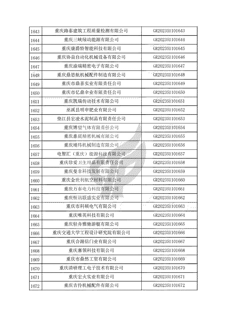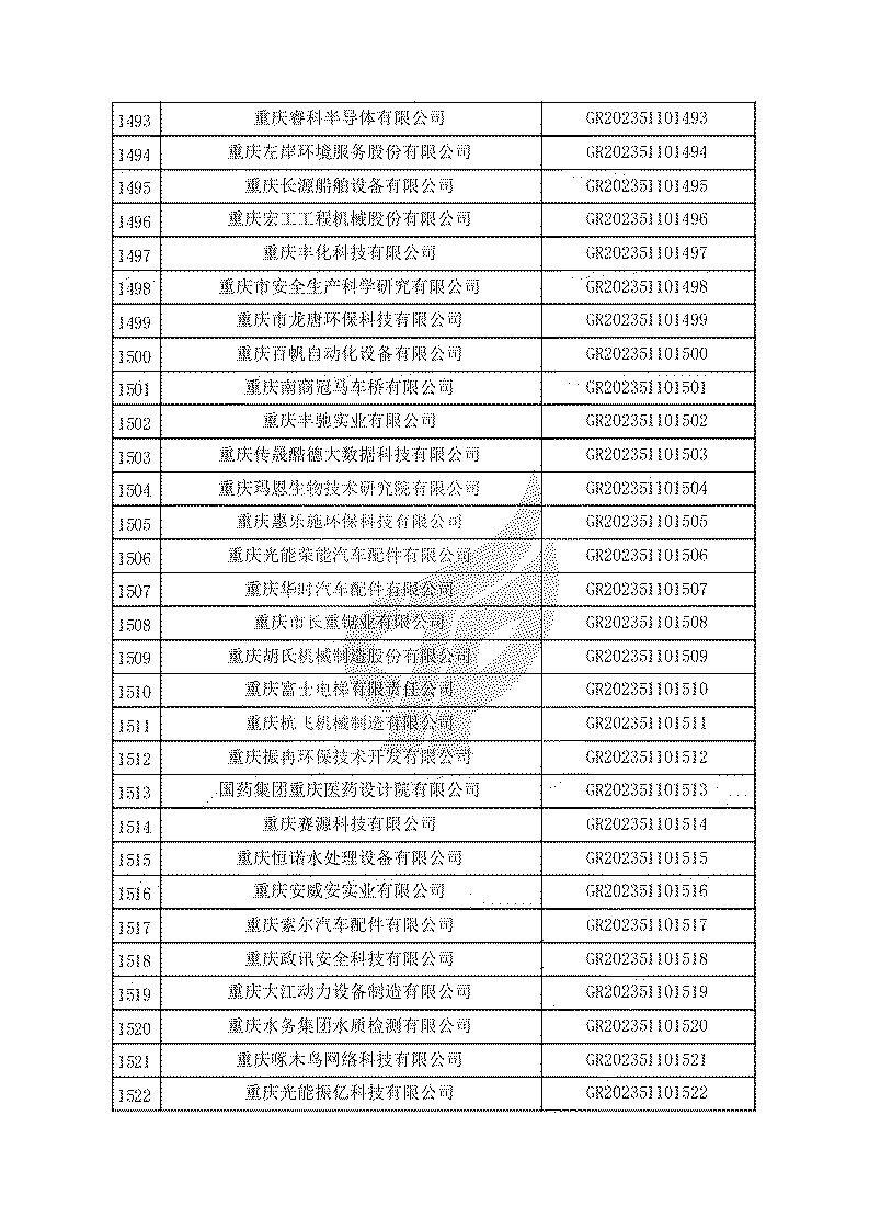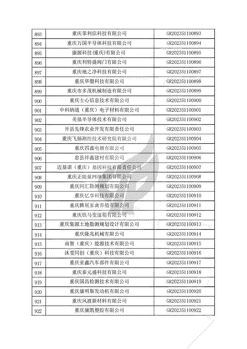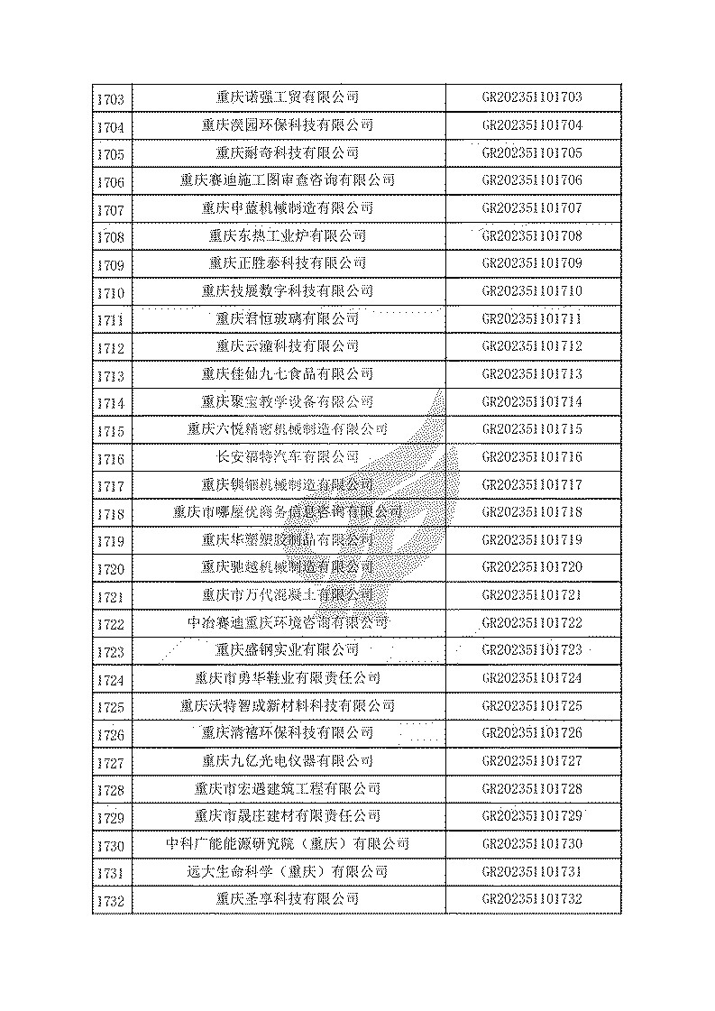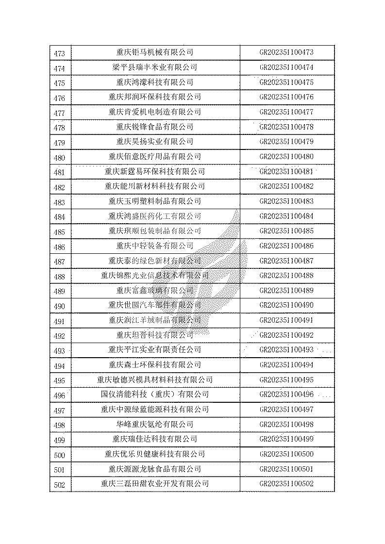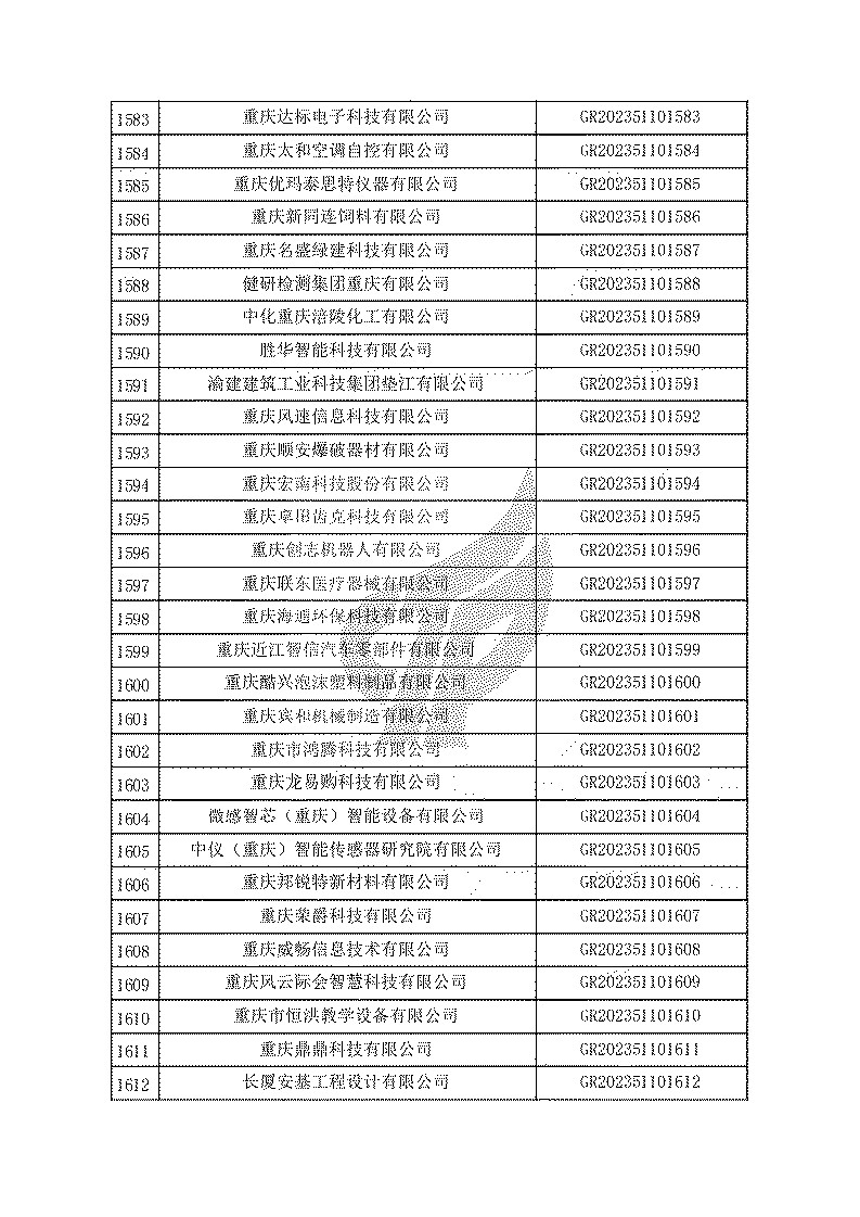 根據(jù)《高新技術(shù)企業(yè)認(rèn)定管理辦法》(國(guó)科發(fā)火〔2016〕32號(hào))和《高新技術(shù)企業(yè)認(rèn)定管理工作指引》(國(guó)科發(fā)火〔2016〕195號(hào))有關(guān)規(guī)定,現(xiàn)對(duì)重慶市認(rèn)定機(jī)構(gòu)2023年認(rèn)定報(bào)備的第一批1779家高新技術(shù)企業(yè)備案名單予以公告。