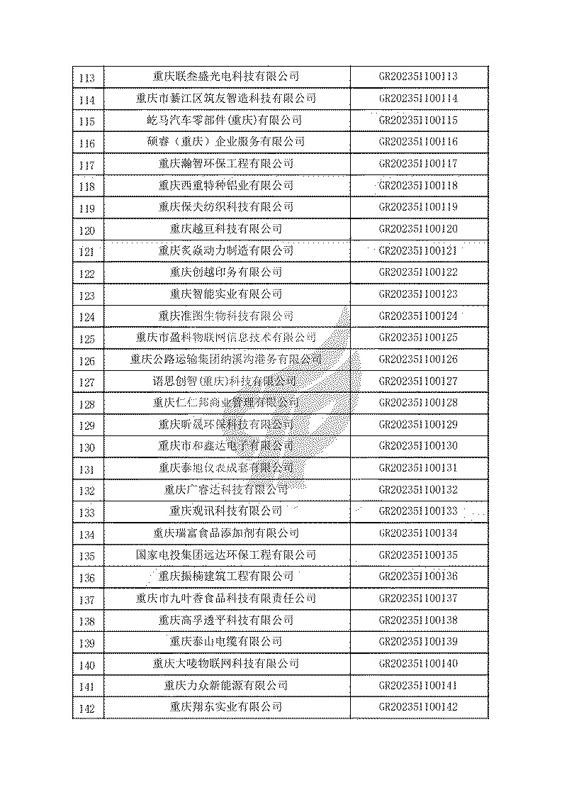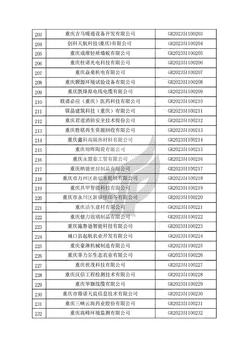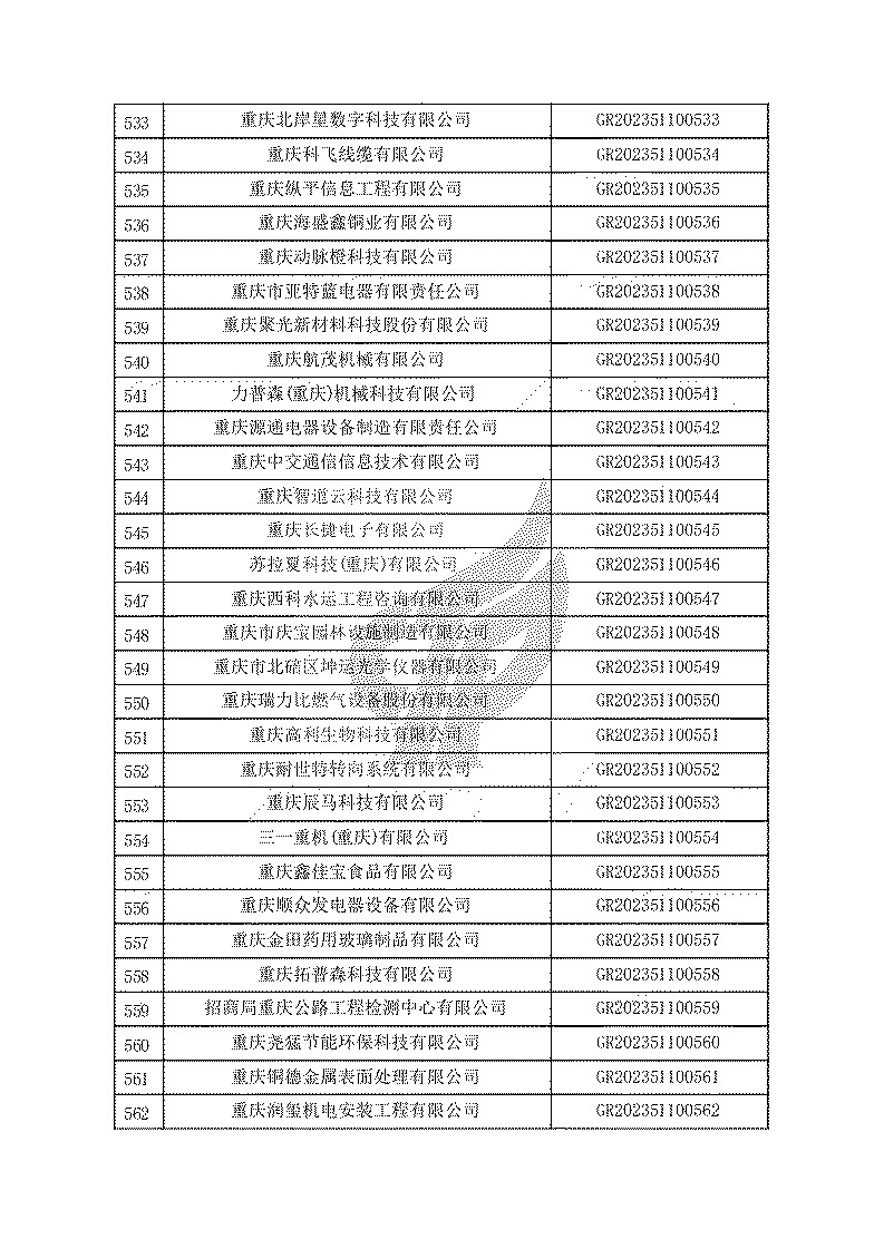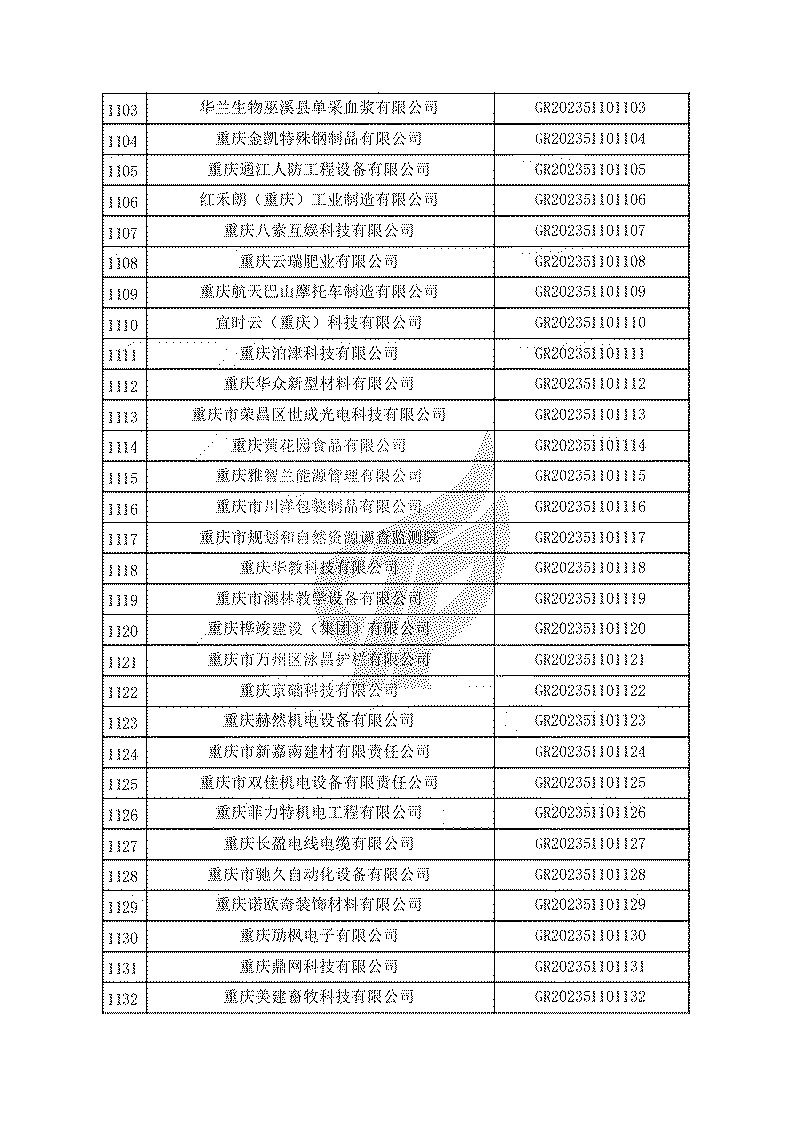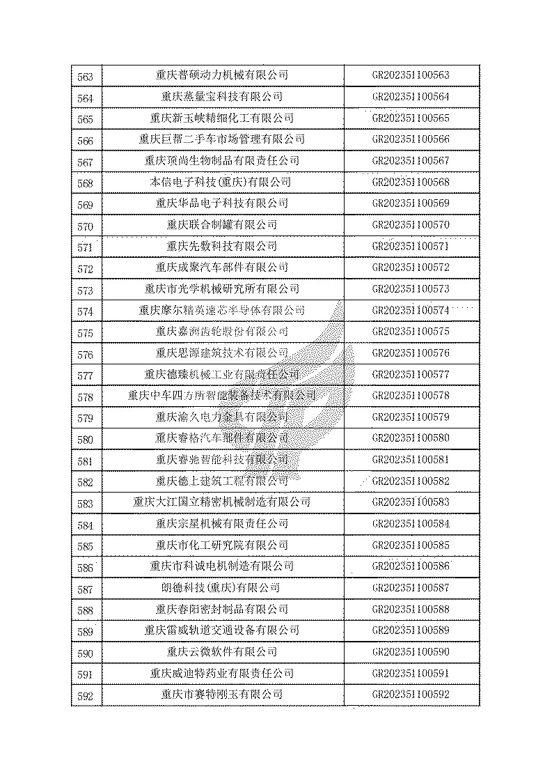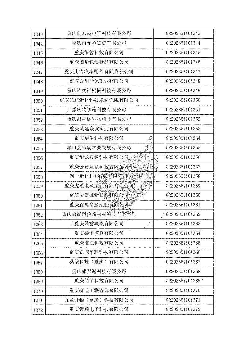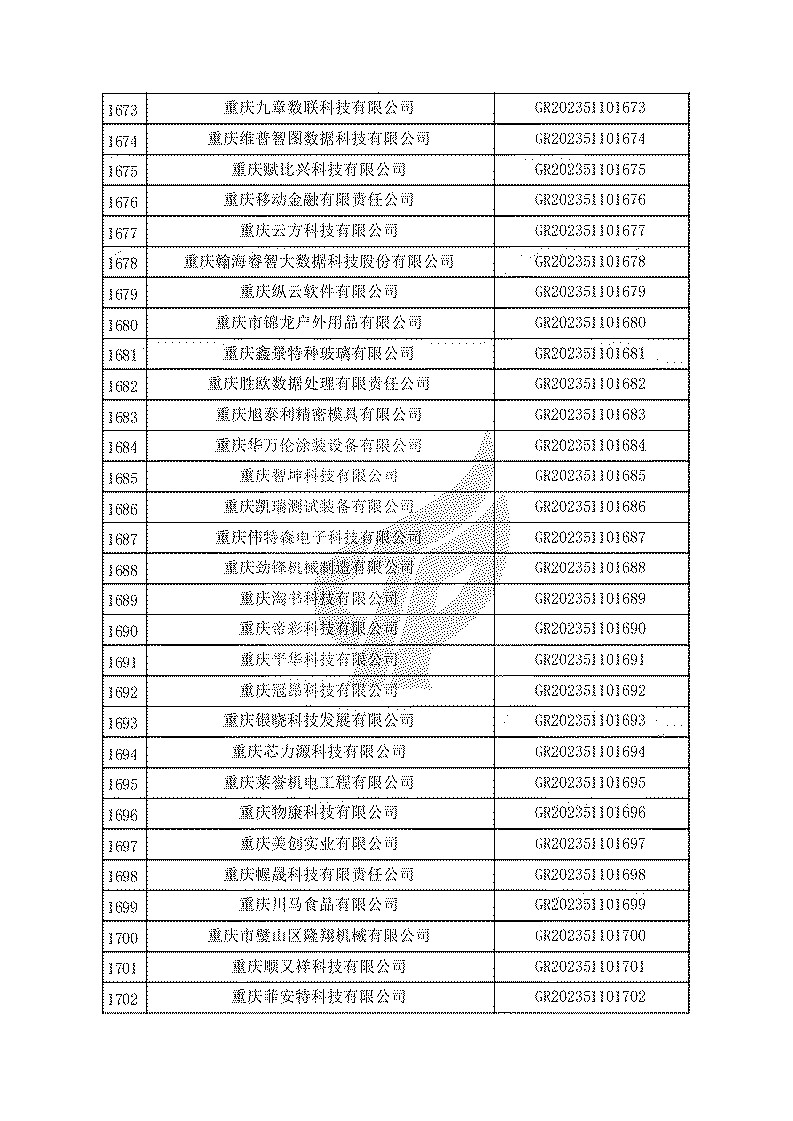 根據(jù)《高新技術(shù)企業(yè)認(rèn)定管理辦法》(國(guó)科發(fā)火〔2016〕32號(hào))和《高新技術(shù)企業(yè)認(rèn)定管理工作指引》(國(guó)科發(fā)火〔2016〕195號(hào))有關(guān)規(guī)定,現(xiàn)對(duì)重慶市認(rèn)定機(jī)構(gòu)2023年認(rèn)定報(bào)備的第一批1779家高新技術(shù)企業(yè)備案名單予以公告。