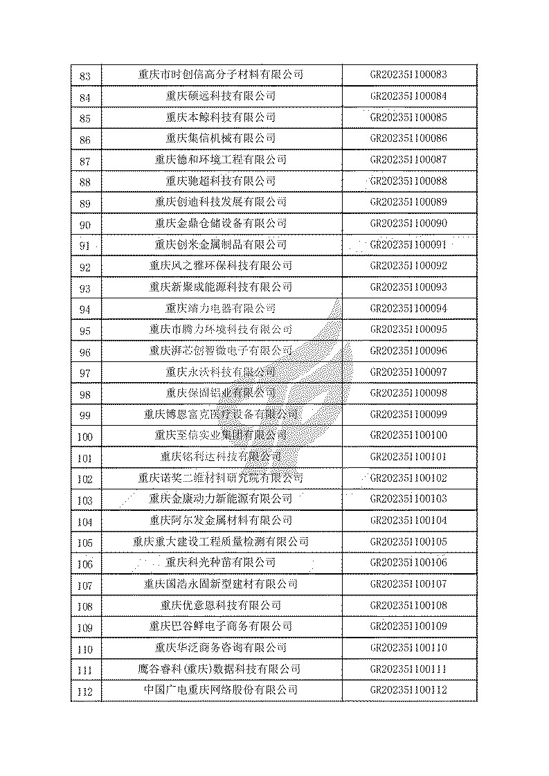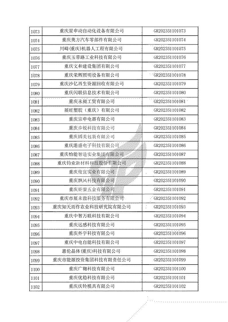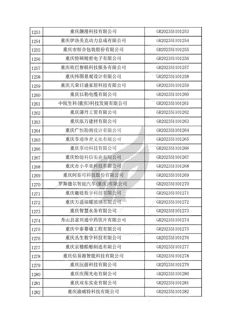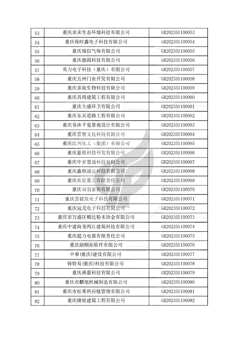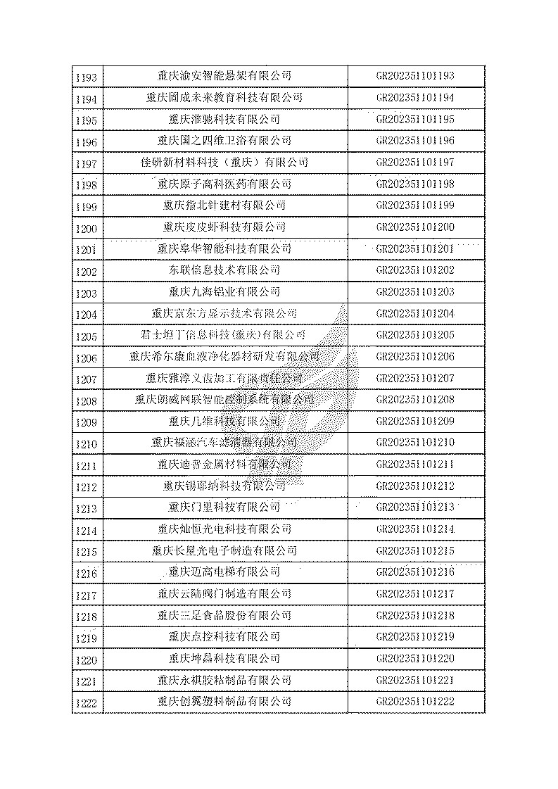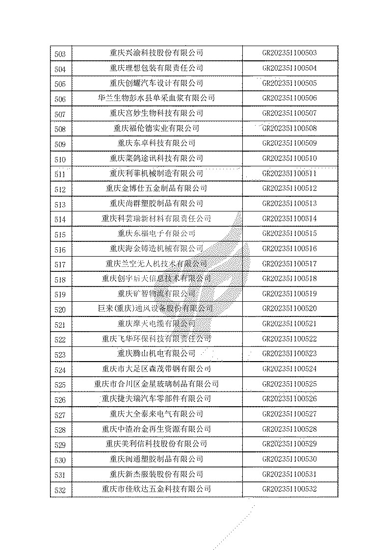 根據(jù)《高新技術(shù)企業(yè)認(rèn)定管理辦法》(國(guó)科發(fā)火〔2016〕32號(hào))和《高新技術(shù)企業(yè)認(rèn)定管理工作指引》(國(guó)科發(fā)火〔2016〕195號(hào))有關(guān)規(guī)定,現(xiàn)對(duì)重慶市認(rèn)定機(jī)構(gòu)2023年認(rèn)定報(bào)備的第一批1779家高新技術(shù)企業(yè)備案名單予以公告。