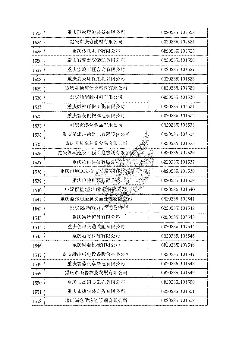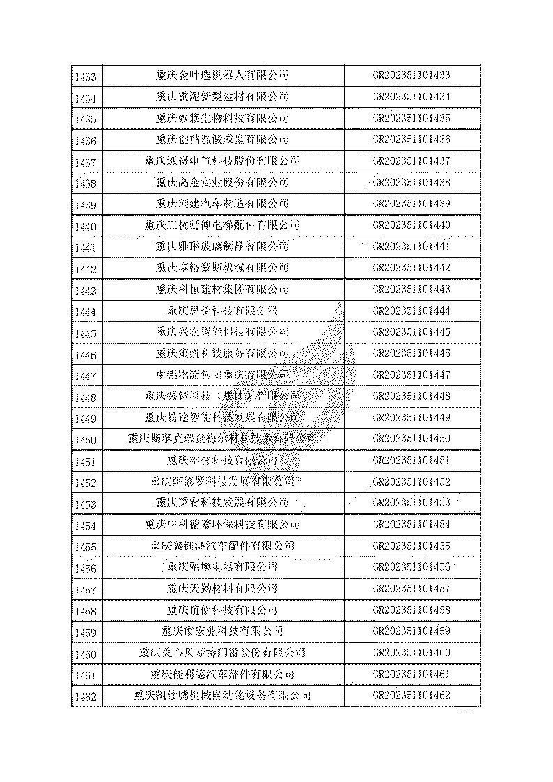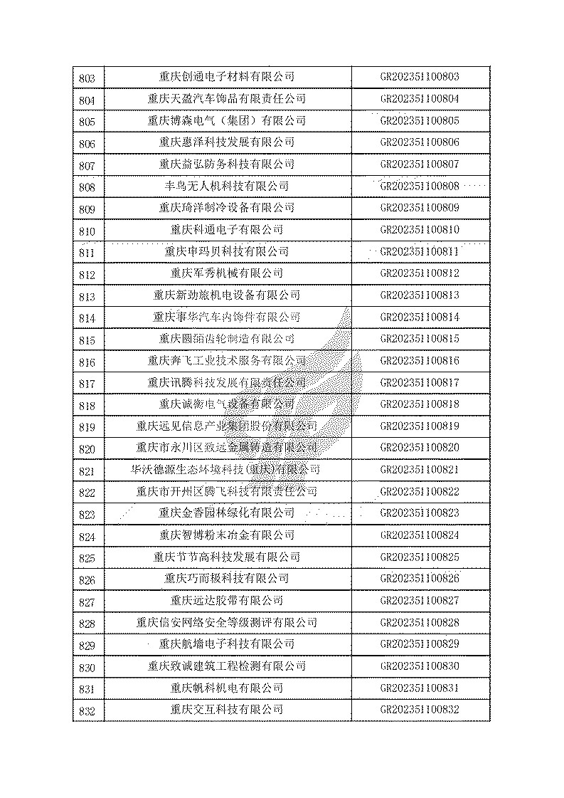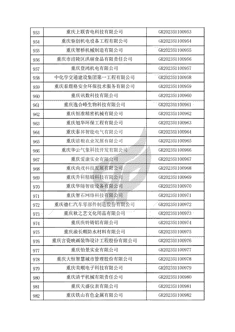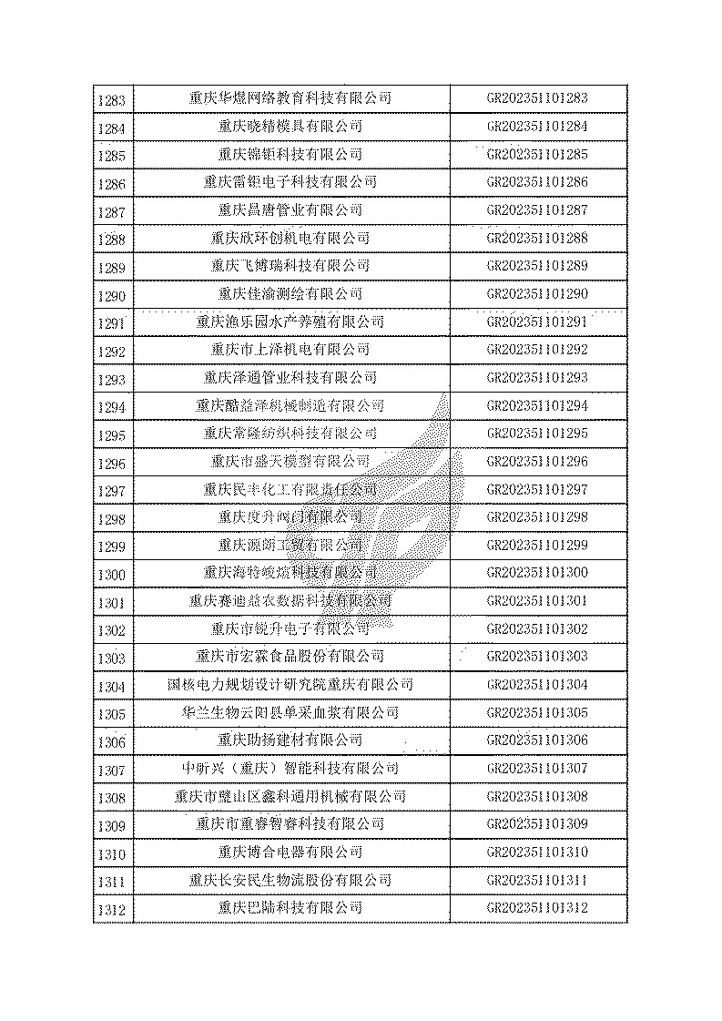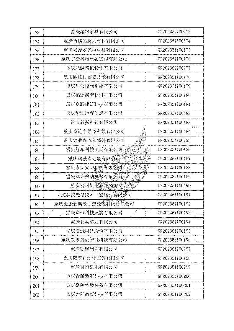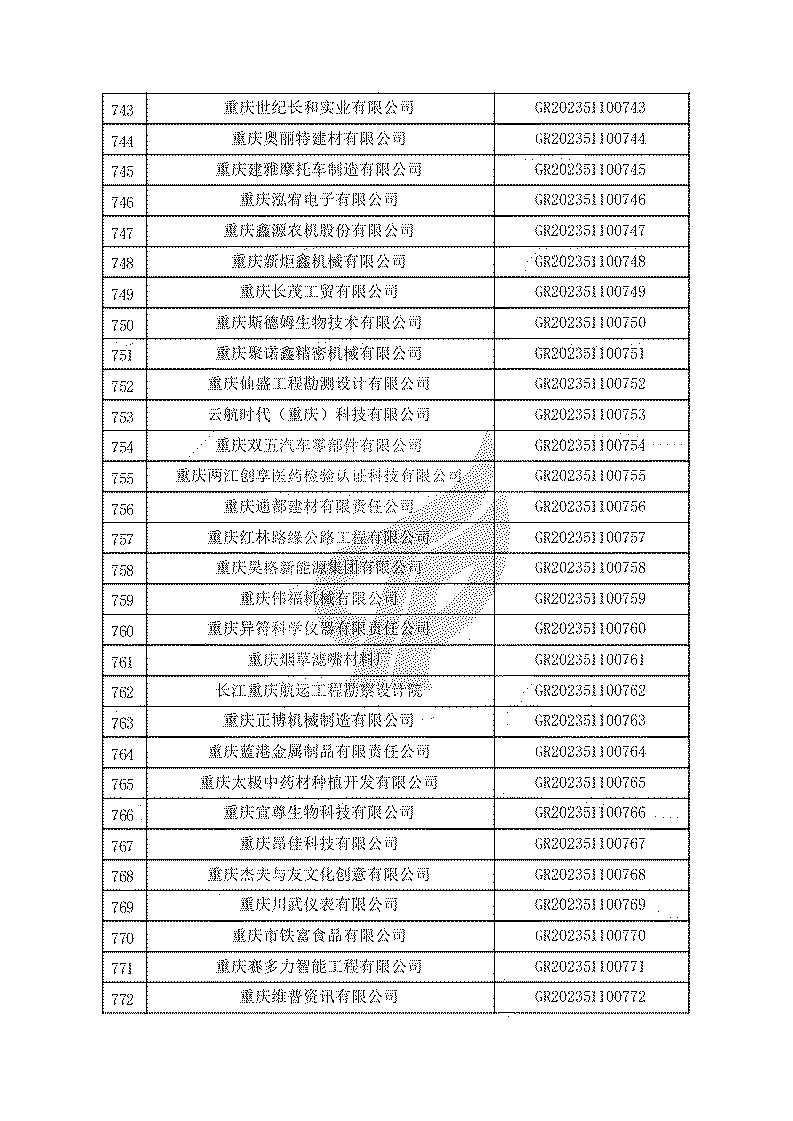 根據(jù)《高新技術(shù)企業(yè)認(rèn)定管理辦法》(國(guó)科發(fā)火〔2016〕32號(hào))和《高新技術(shù)企業(yè)認(rèn)定管理工作指引》(國(guó)科發(fā)火〔2016〕195號(hào))有關(guān)規(guī)定,現(xiàn)對(duì)重慶市認(rèn)定機(jī)構(gòu)2023年認(rèn)定報(bào)備的第一批1779家高新技術(shù)企業(yè)備案名單予以公告。