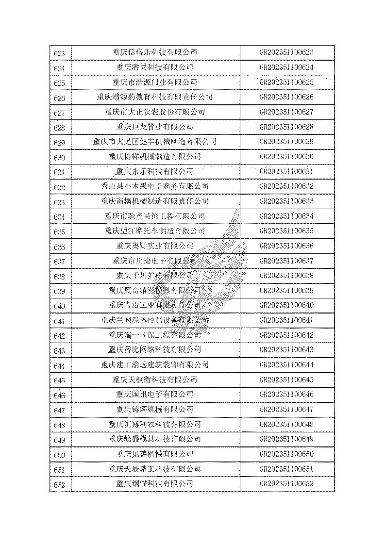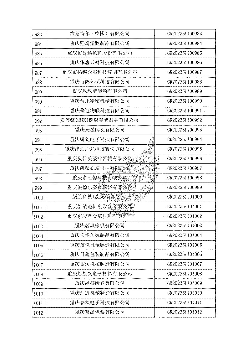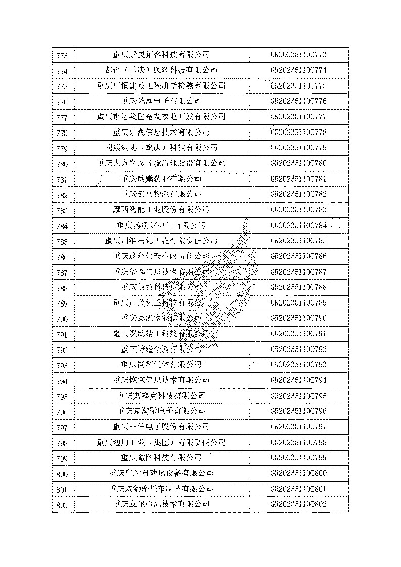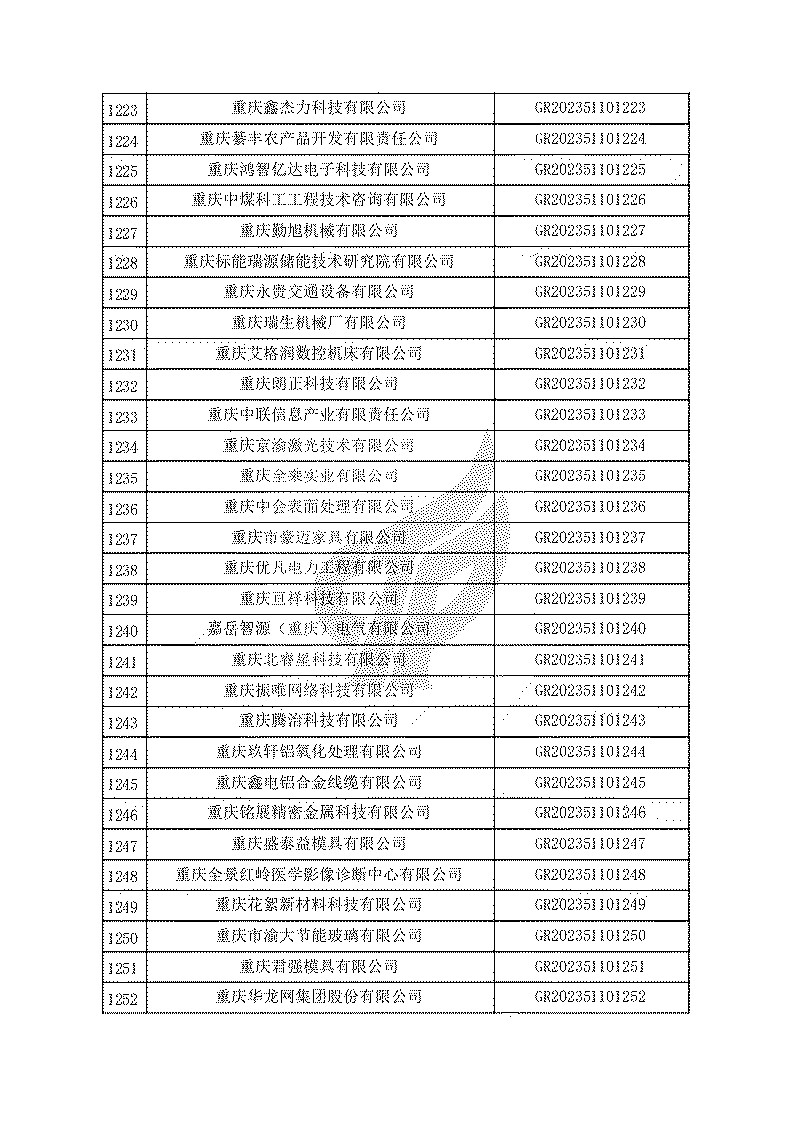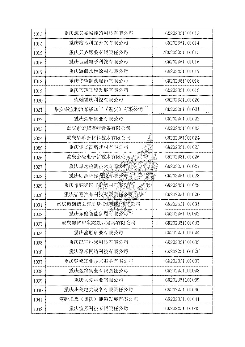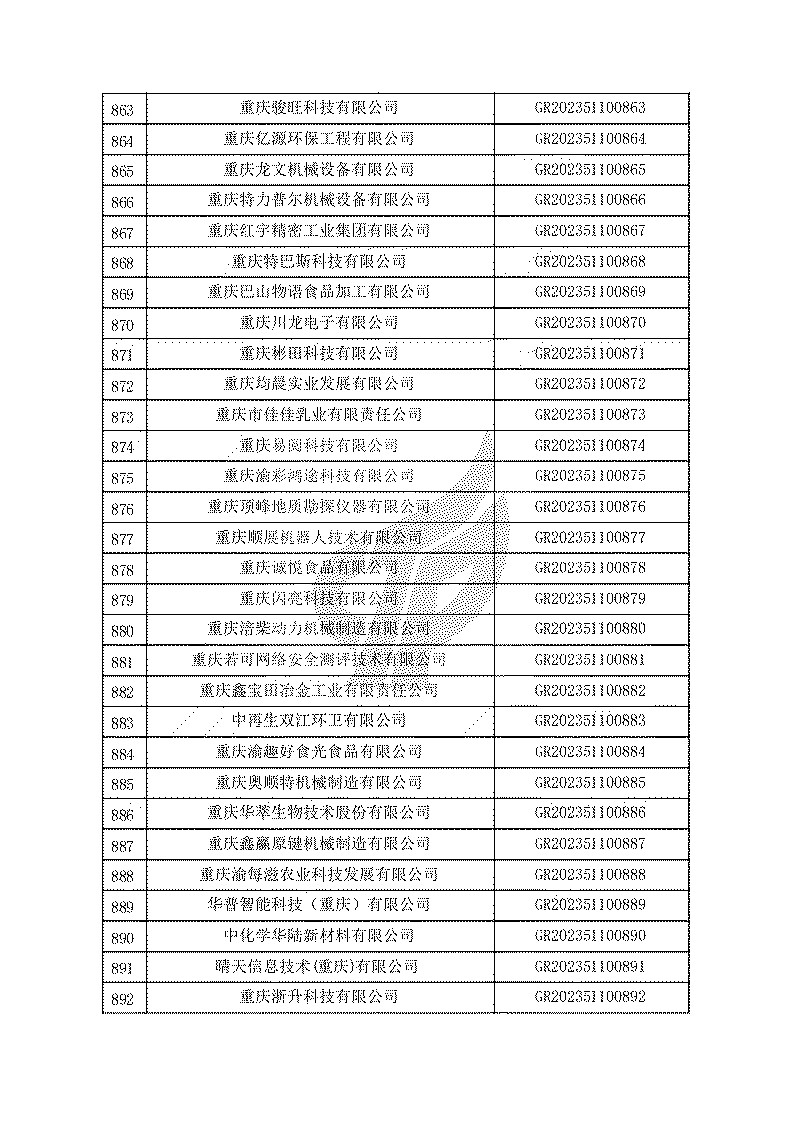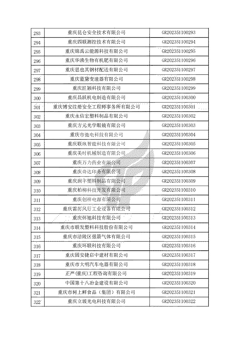 根據(jù)《高新技術(shù)企業(yè)認(rèn)定管理辦法》(國(guó)科發(fā)火〔2016〕32號(hào))和《高新技術(shù)企業(yè)認(rèn)定管理工作指引》(國(guó)科發(fā)火〔2016〕195號(hào))有關(guān)規(guī)定,現(xiàn)對(duì)重慶市認(rèn)定機(jī)構(gòu)2023年認(rèn)定報(bào)備的第一批1779家高新技術(shù)企業(yè)備案名單予以公告。