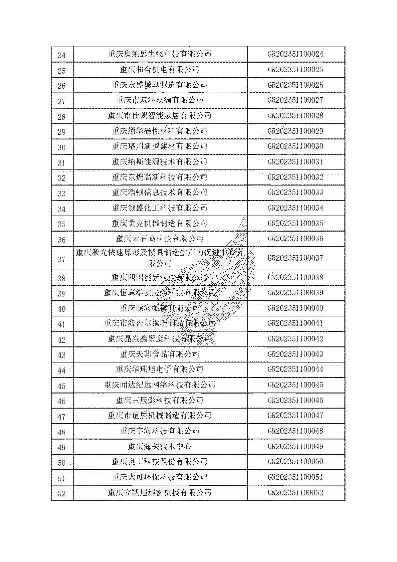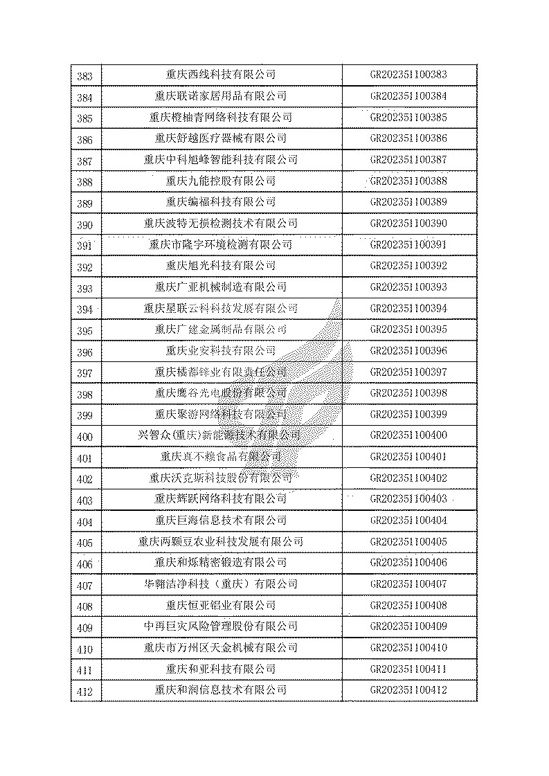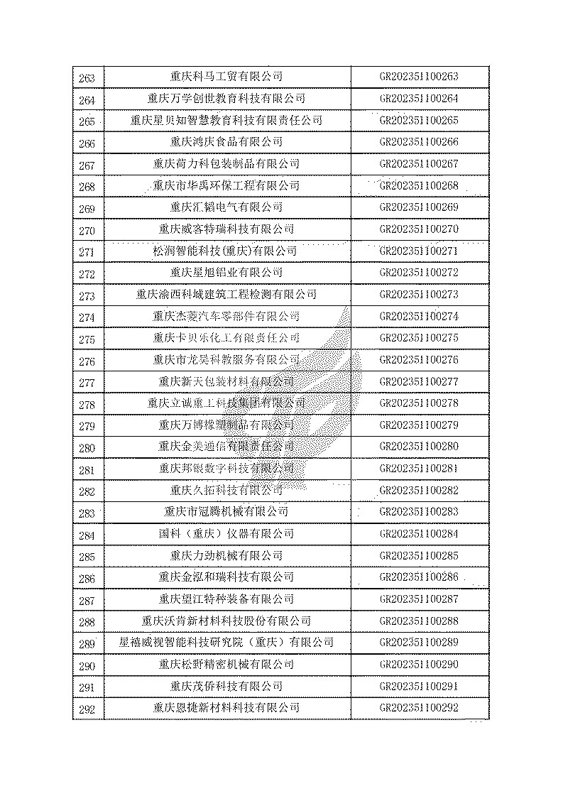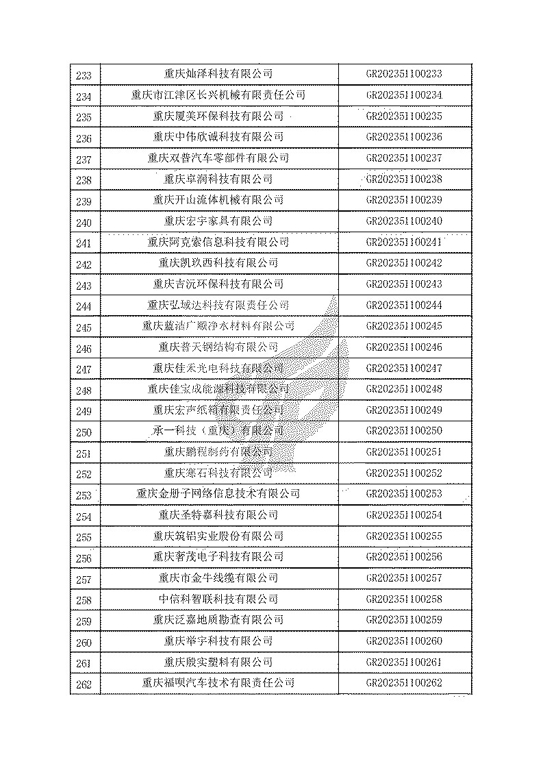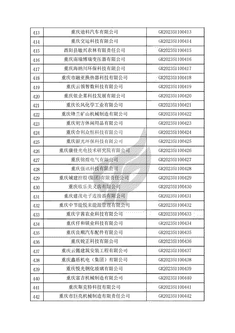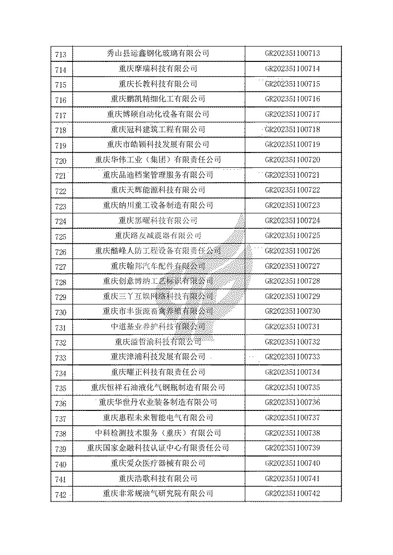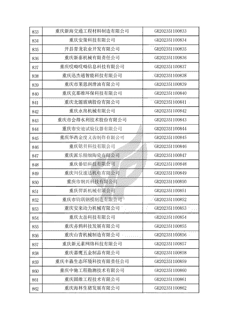 根據(jù)《高新技術(shù)企業(yè)認(rèn)定管理辦法》(國(guó)科發(fā)火〔2016〕32號(hào))和《高新技術(shù)企業(yè)認(rèn)定管理工作指引》(國(guó)科發(fā)火〔2016〕195號(hào))有關(guān)規(guī)定,現(xiàn)對(duì)重慶市認(rèn)定機(jī)構(gòu)2023年認(rèn)定報(bào)備的第一批1779家高新技術(shù)企業(yè)備案名單予以公告。